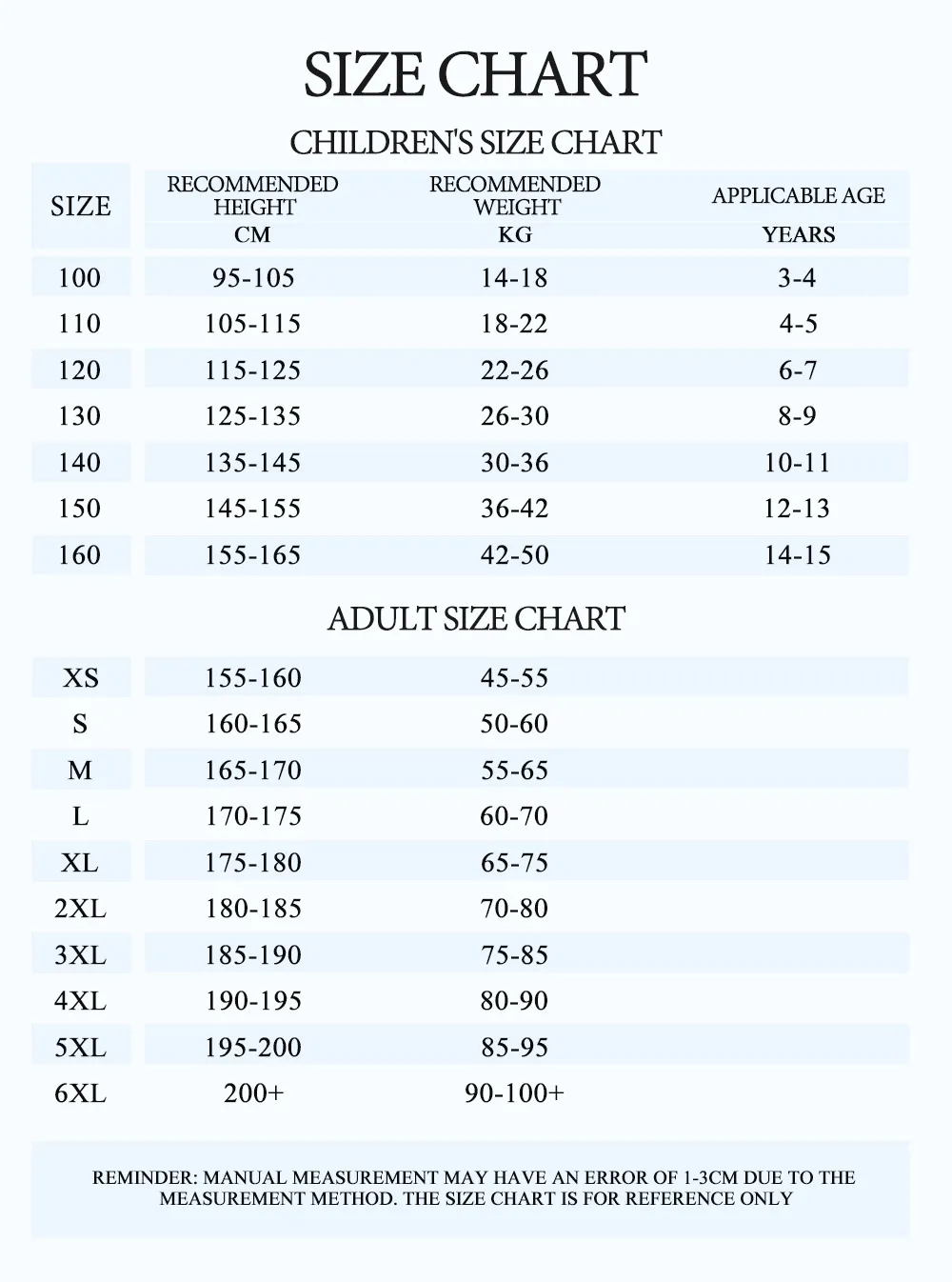 size XS, S, M, L, XL, 2XL, 3XL, 4XL, 5XL, 6XL, C100, C110, C120, C130, C140, C150, C160